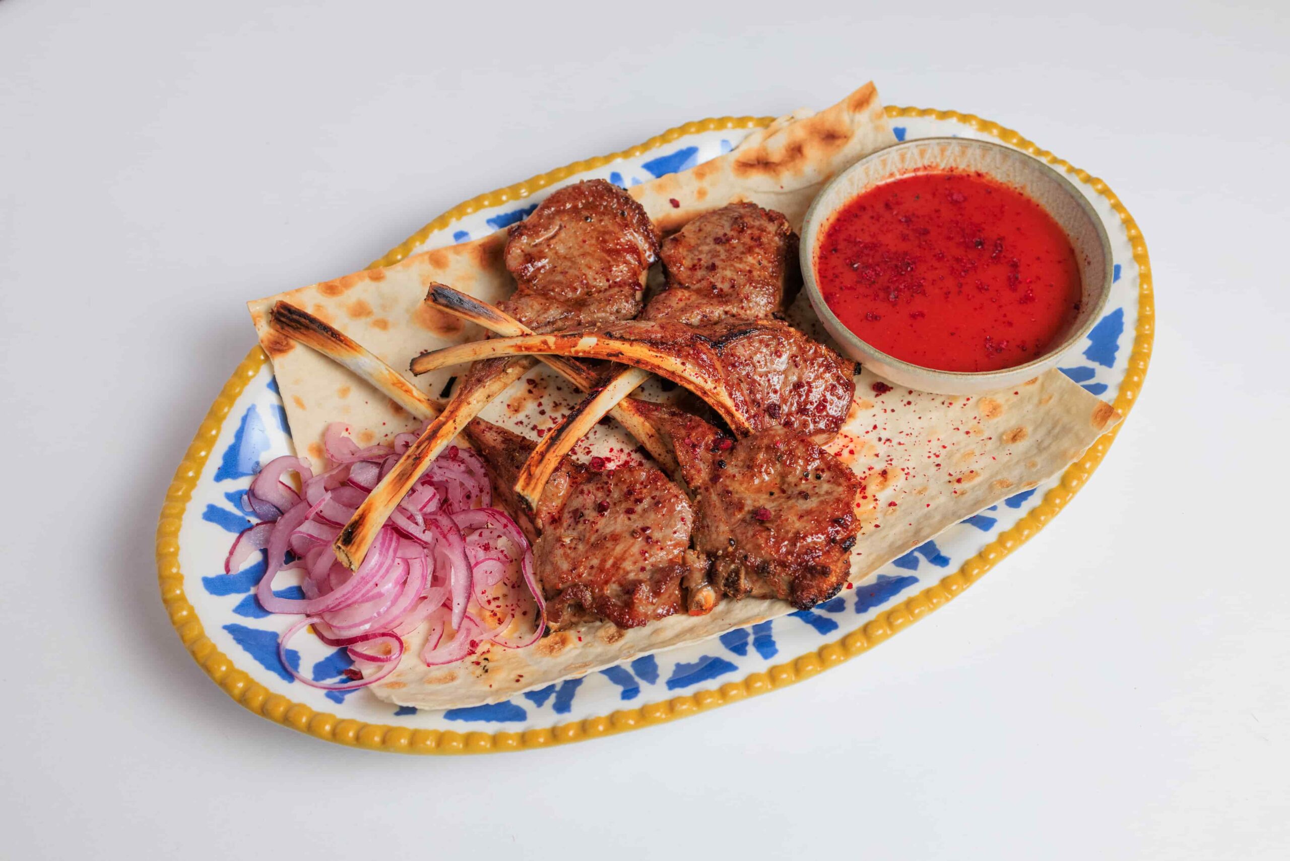 Баранина корейка мариновая (соль, перец, паприка). Кавказский лаваш, сумах (приправа), лук красный.