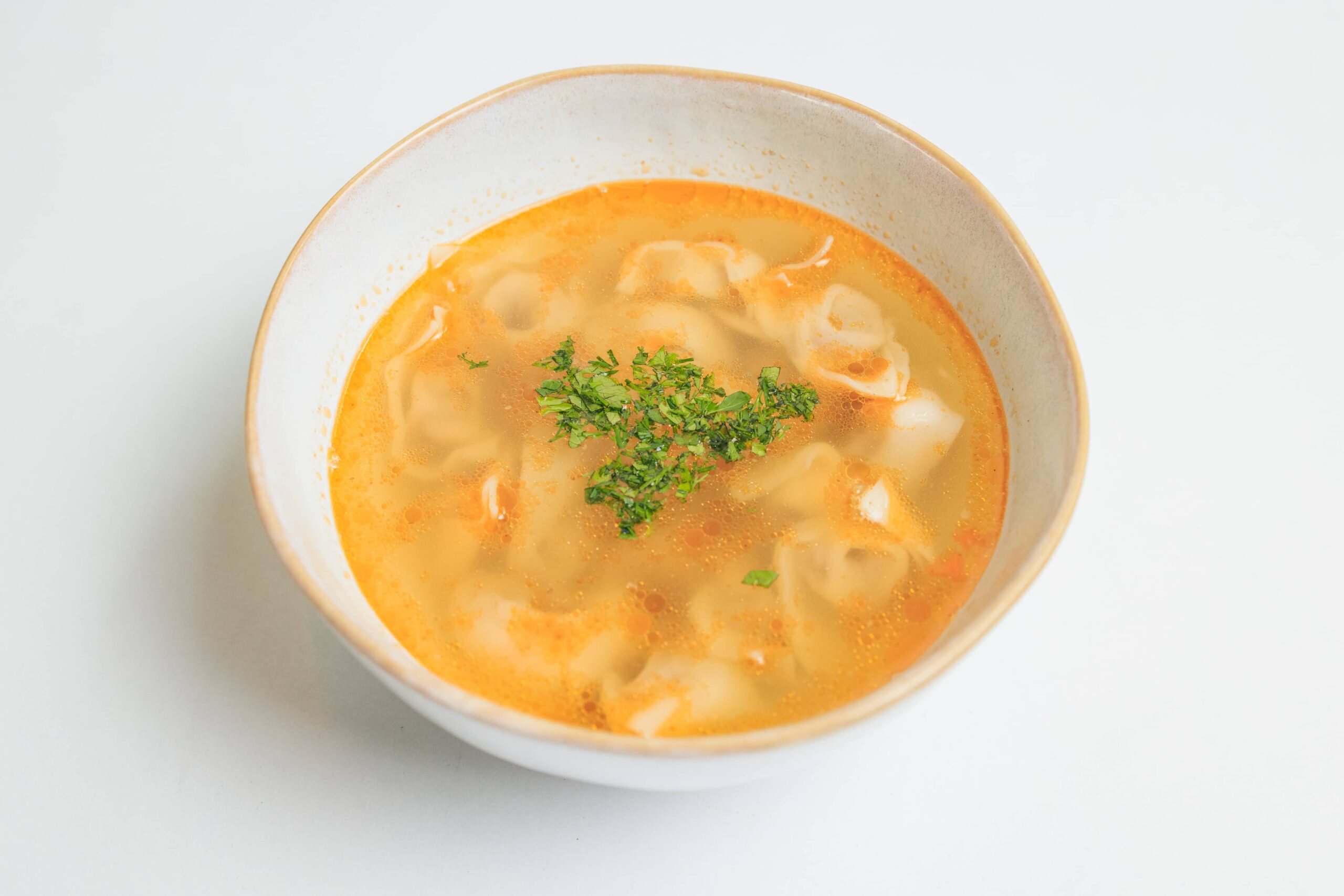 Бульон из баранины, чучвара (маленькие пельмешки) фарш баранина+говядина. Подается в глубокой тарелке, посыпается укропом и кинзой.