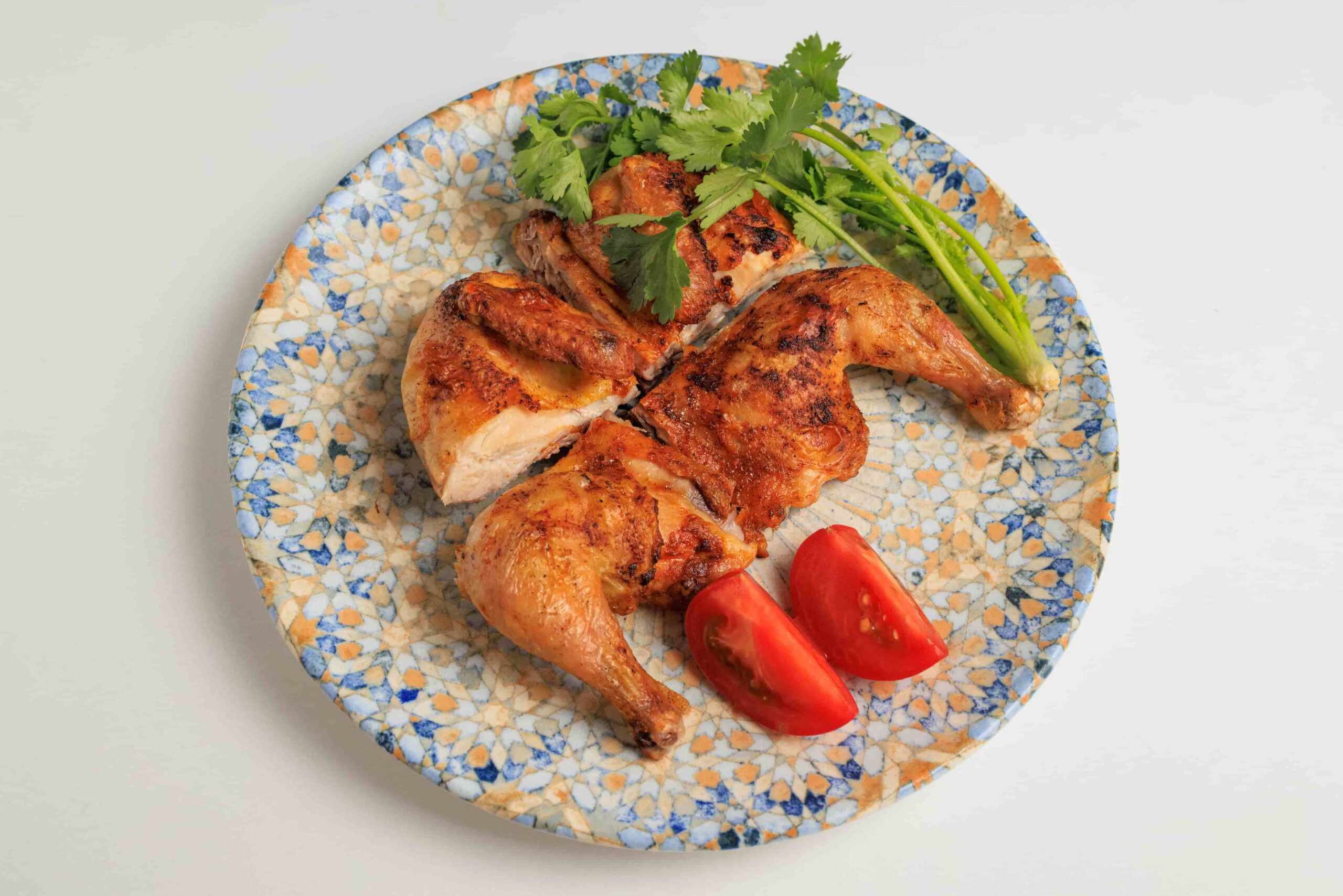 Цыпленок маринуется в специях, жарится под прессом, в конце обмазывают аджично-чесночным маслом.