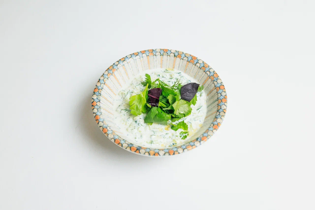Свежий и малосольный огурец, греческий йогурт, чеснок, украшается миксом зеленью (укроп, петрушка, кинза, фиолетовый базилик)