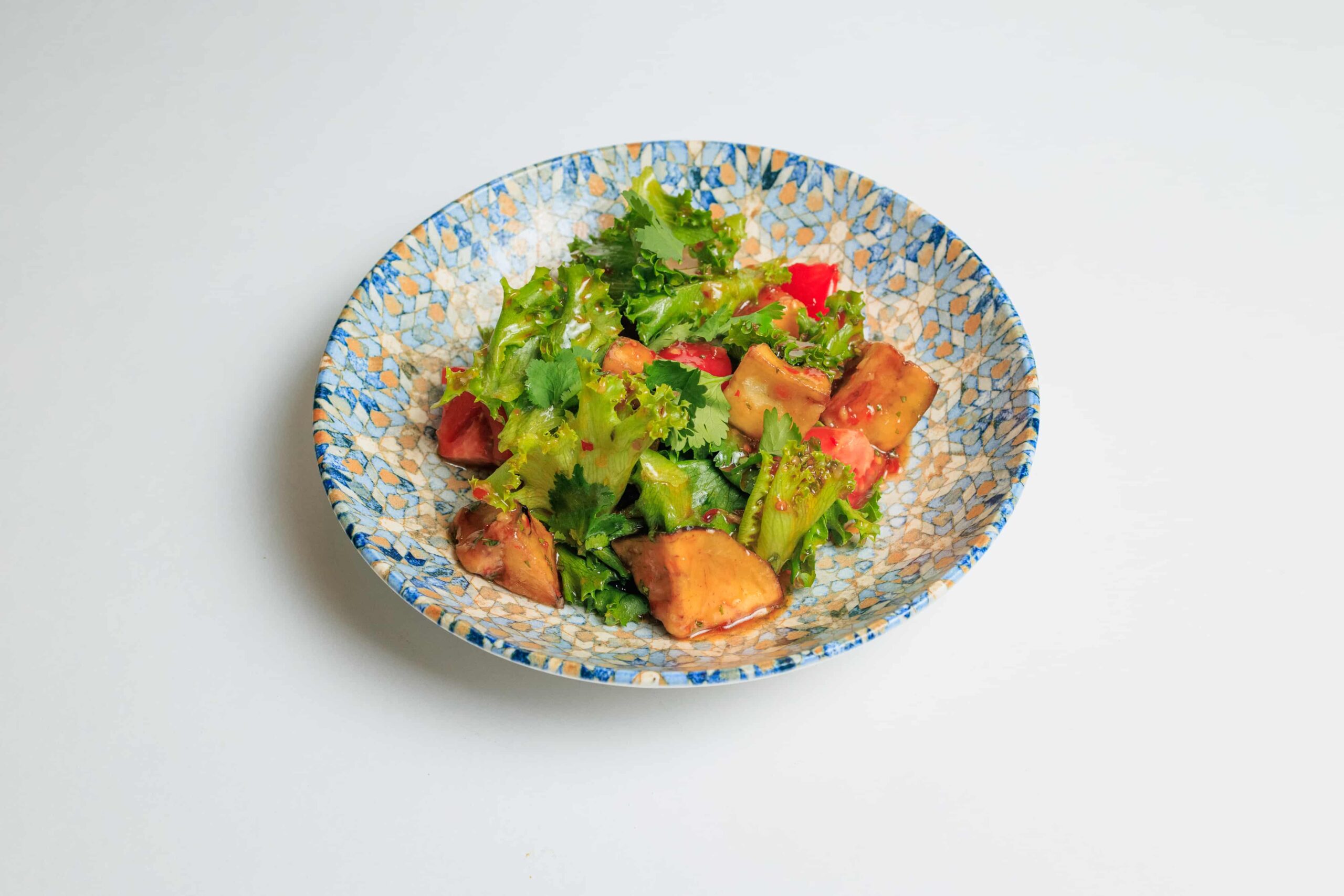 Баклажаны обжариваются во фритюре, подаются с соусом (чили сладкий, чили гарклик, устричный соус, кунжутное масло, лимонный фреш, кинза), добавляются помидоры канкасе. При подаче украшается кинзой.