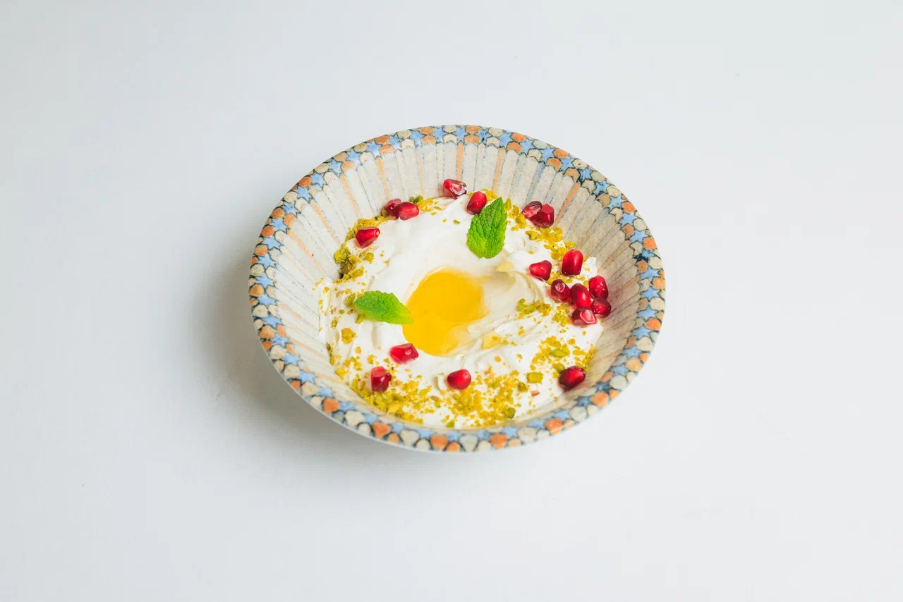 Сыр креметте, сметана, лимонный сок. Украшается фисташками, гранатом, оливковым маслом и листьями мяты.