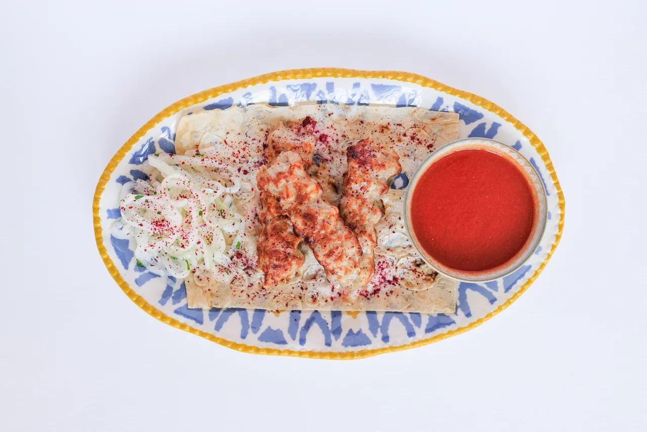 Бедро куриное, говяжий жир, соль, перец. Кавказский лаваш, сумах (приправа), лук красный.