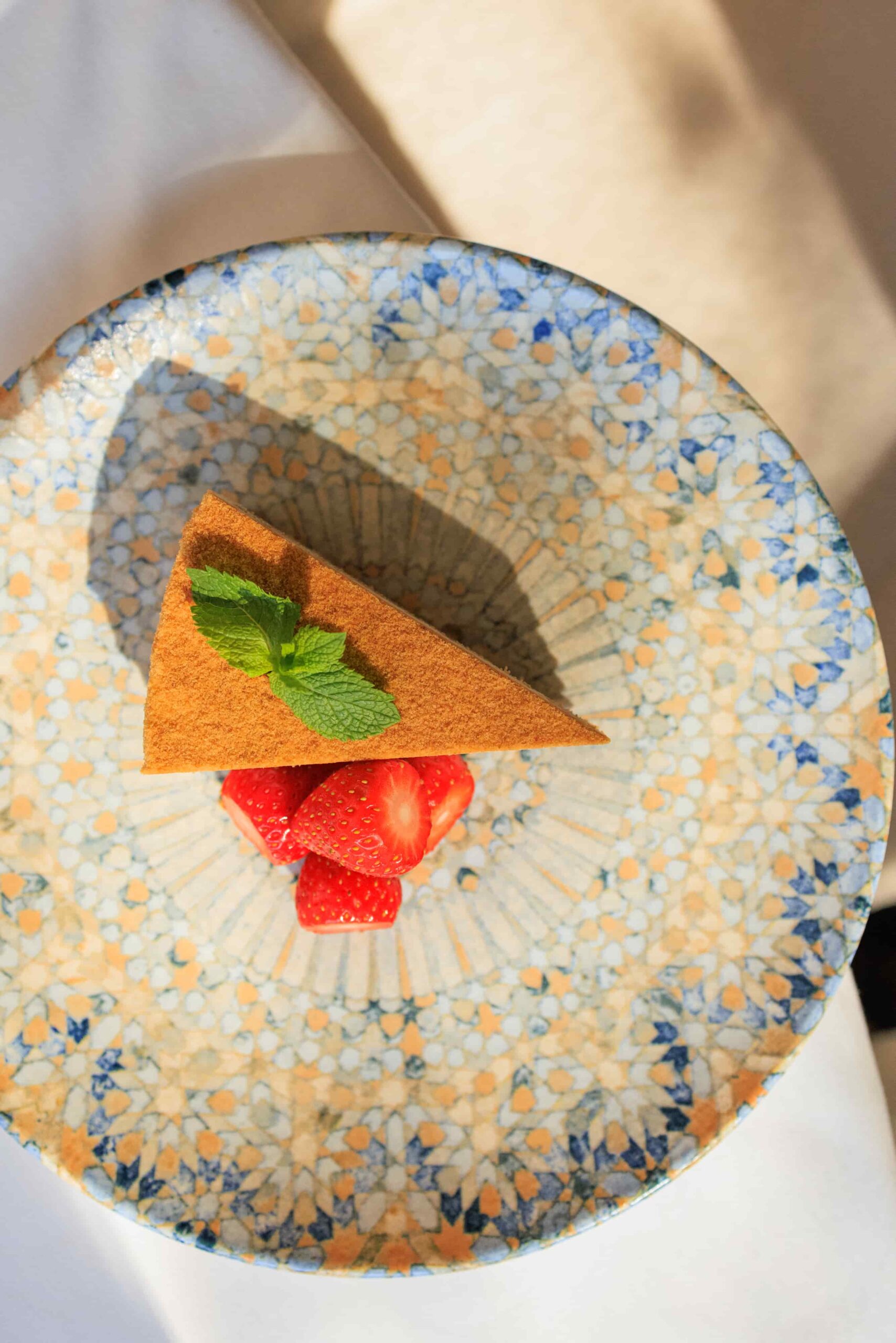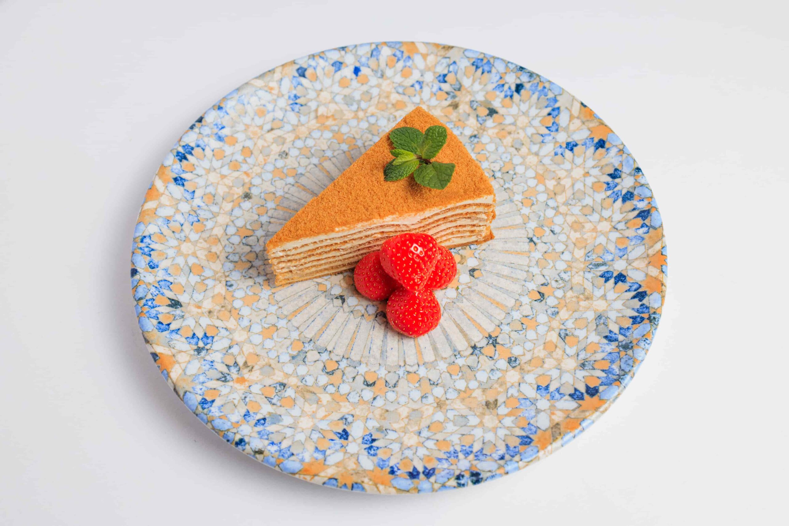 Классический медовик на гречишном меде, украшается клубникой и мятой.