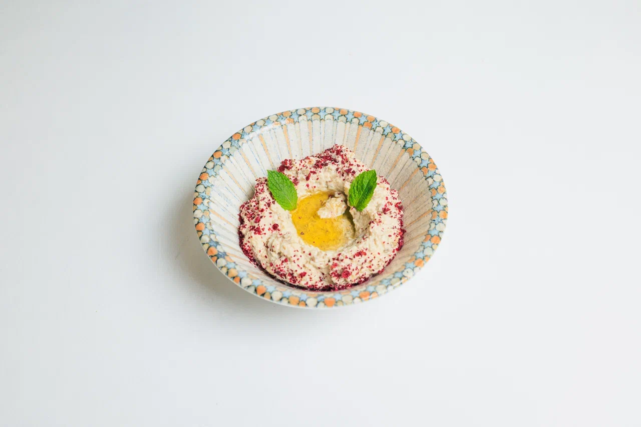 Баклажаны запеченые перетертые, масло оливковое, паста тахина, чеснок, сметана. Украшается листьями мяты и тертым барбарисом