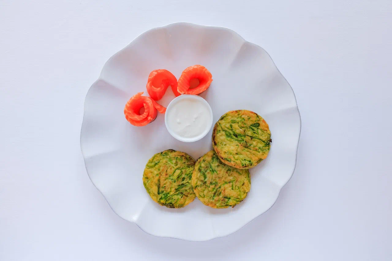 Слабосоленый лосось подается с оладьими из кабачков или цукини (по сезону). Оладьи из кабачков, яйцо, мука. В порции три оладушка. Подается со сметаной и миксом зелени.