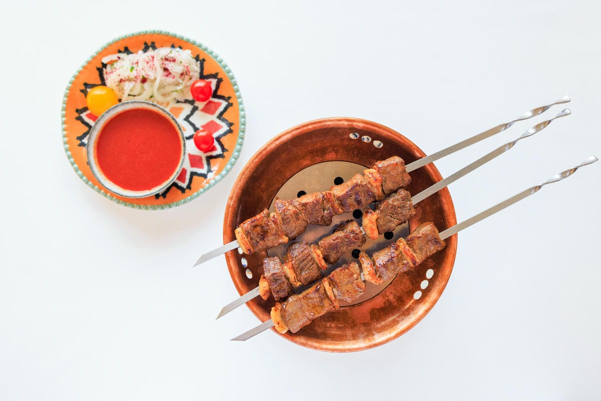 Печень барания и по центру курдюк. Соус восточный, красный лук, помидор черри.