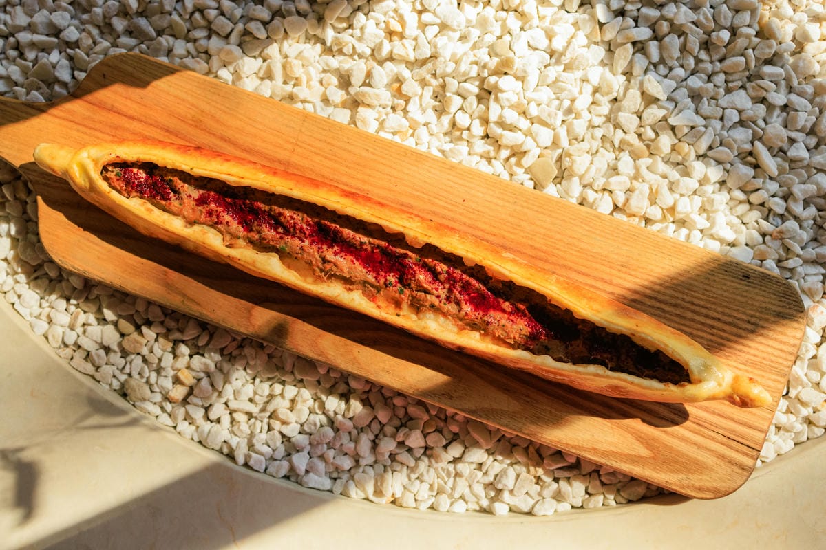 Дрожжевое тесто, фарш говядины (помидор, перец красный, лук репчатый, петрушка, чеснок, соль, черный перец, оливковое масло), сливочное масло (БЕЗ СЫРА!)