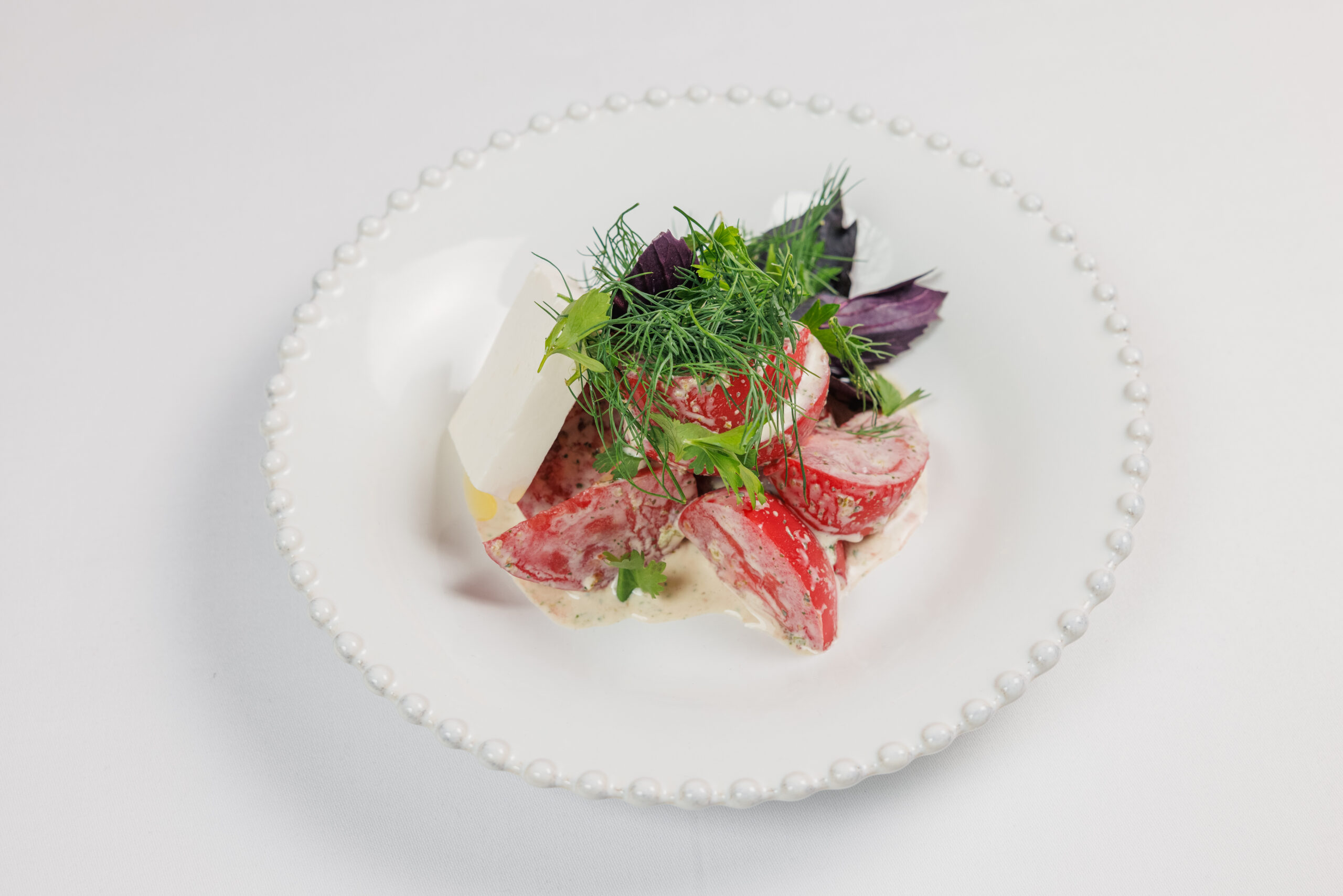 Свежие помидоры, сыр Фета, Заправка: йогурт греческий, аджика зеленая. Украшается укропом, базилик, кинза (микс зелени)