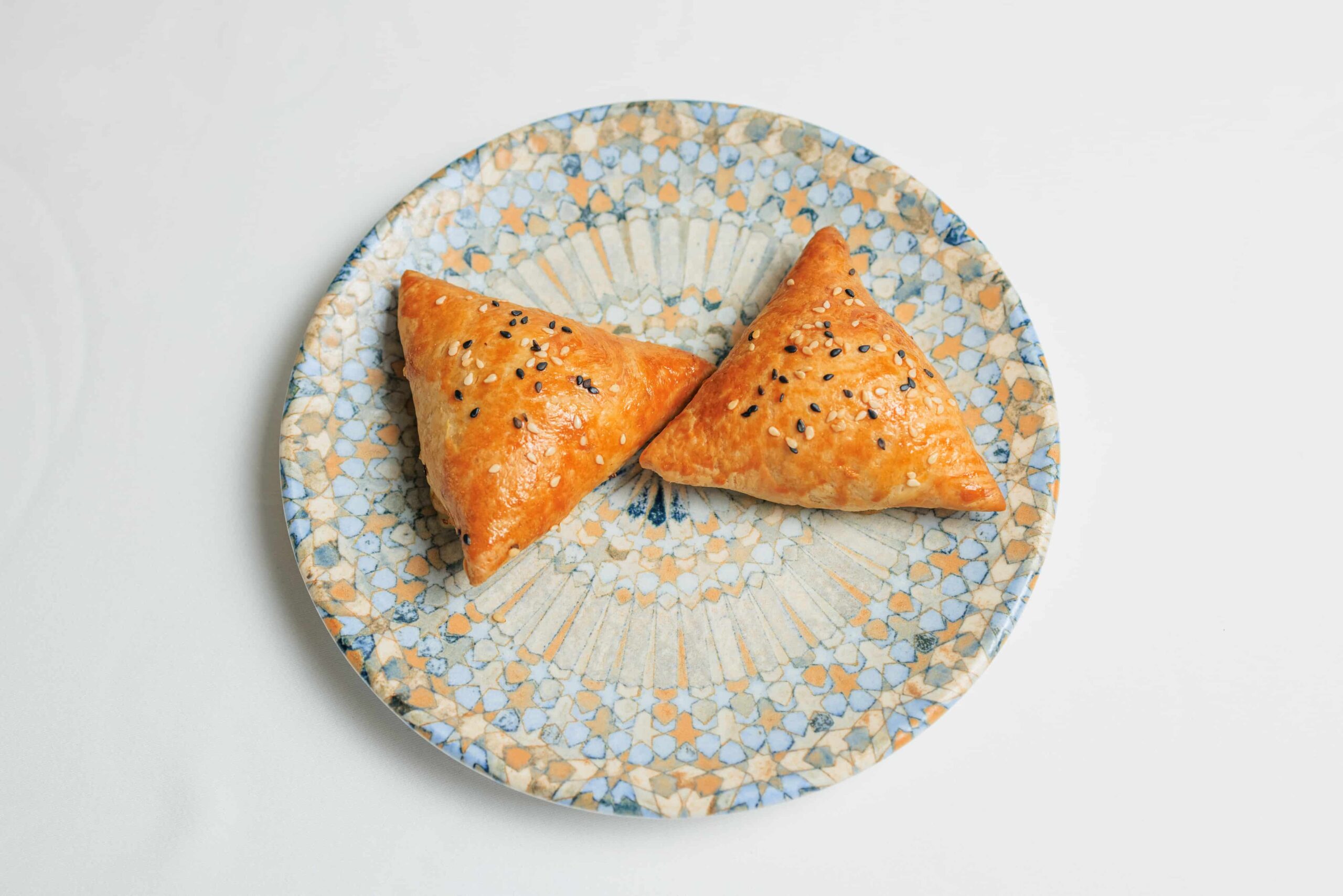 Слоеное тесто: вода, мука, яйцо, молоко. Фарш из баранины, бараний жир, специи. Посыпается микс кунжутом.