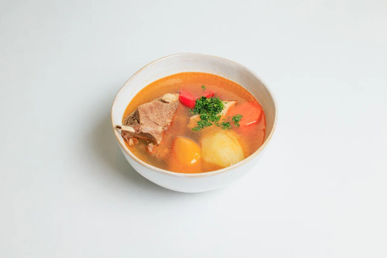 Бульон из баранины, баранья корейка, картофель, болгарский перец, красная морковь, чеснок, соль , перец. Подается в глубокой пиале, украшается зеленью (укроп).