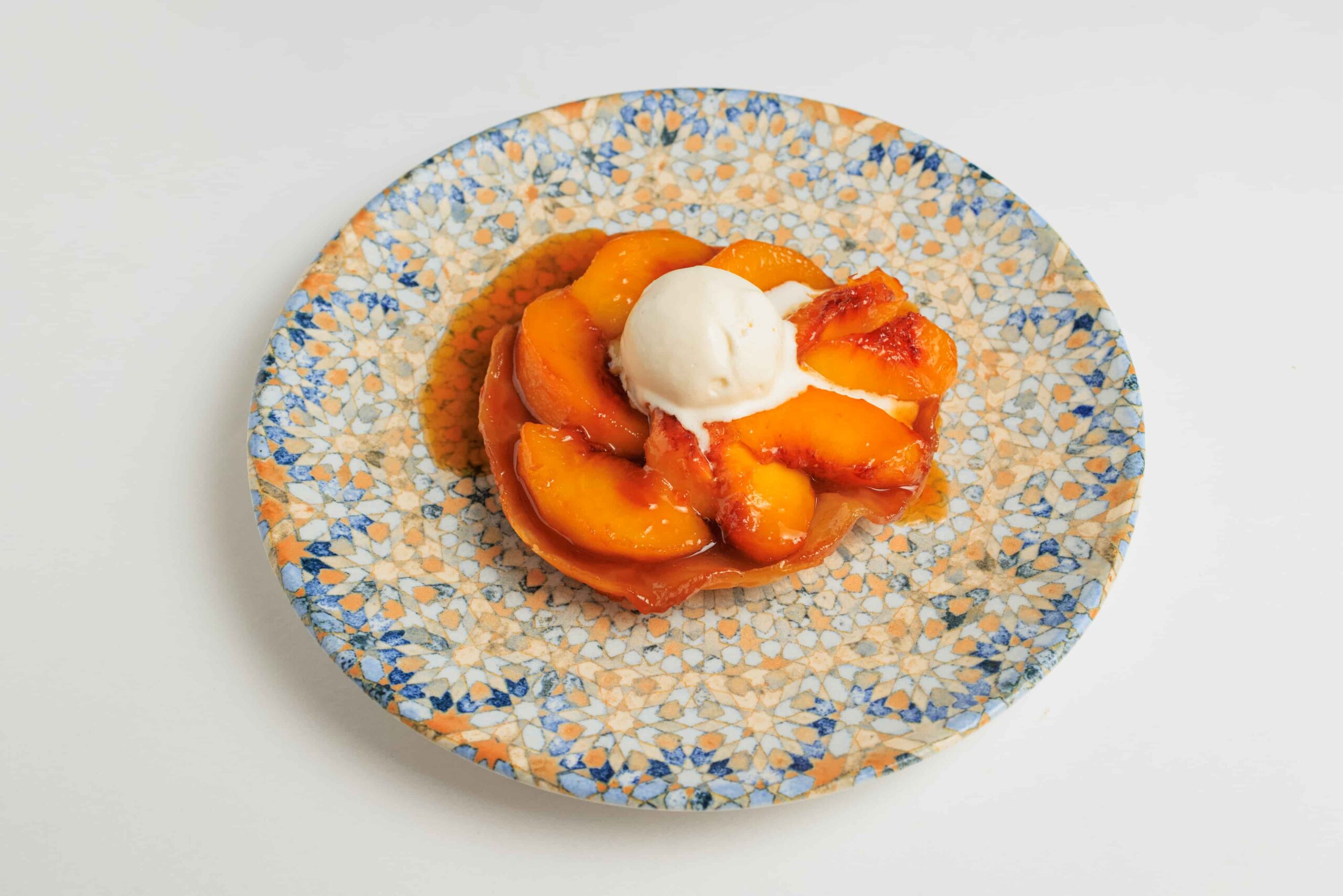 Слоеное бездрожжевое тесто, свежие персики в карамели, все вместе отпекается в печи и подается в горячем виде с шариком мороженого пломбир.